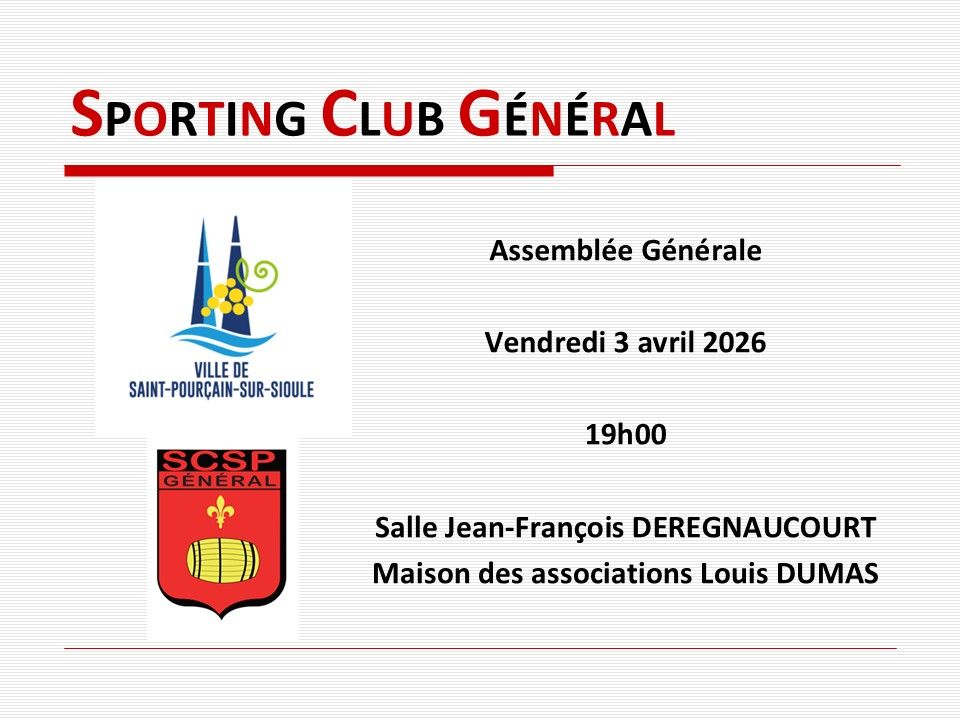 Le 21 MARS 2025, à 18h30, les membres de l'association Sporting Club Général Saint-Pourcinois se sont réunis salle Jean-François DERÉGNAUCOURT, Maison des associations Louis DUMAS, en Assemblée Générale Ordinaire sur convocation du secrétaire.