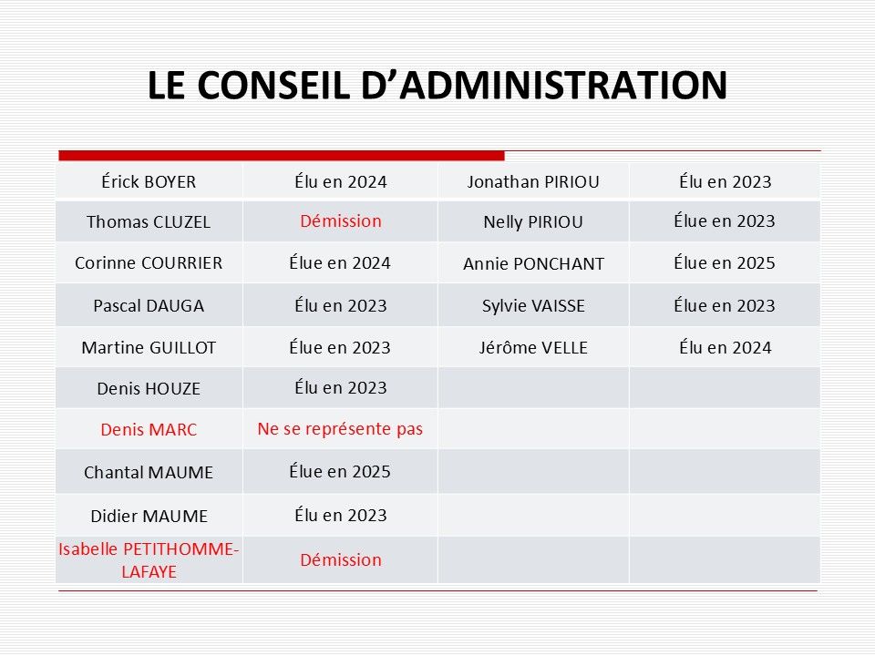 Mme Martine VINCENT-DUCROCQ, élue comme membre du Conseil d’Administration en 2022, a démissionné.
